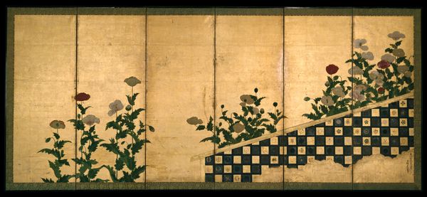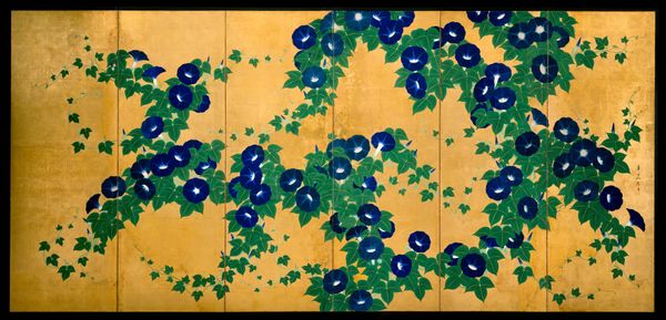 Ogata Kenzan is best known as a potter, but he was also a successful painter, especially after moving from Kyoto to Edo in his late sixties. Kenzan was the younger brother of painter Ogata Kōrin, from whom the decorative Rinpa school takes its name—rin from Kōrin paired with pa, meaning “school.” On a ground of gold leaf, Kenzan presents red and white camellias blooming on a small hillock below a large plum tree at right and, at left, pink, white, and red hollyhocks. With this placement of the motifs, Kenzan turned the folded surface of the screen into a vital component of the composition.