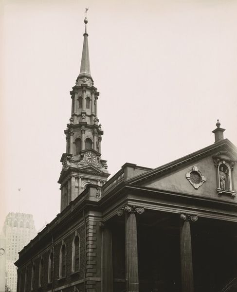 Curator: This is Albert Renger-Patzsch's photograph, "Münster in Westphalia, St Clement’s Church, Built by Schlaun," now part of the Tate Collections. It offers a study in architectural form. Editor: It’s imposing, almost severe. The monochrome adds to the feeling of monumentality. I wonder about the social context of photographing such a structure? Curator: This church, designed by Schlaun, a prominent architect, represents power and faith within the urban landscape of Münster. Renger-Patzsch, active in the New Objectivity movement, sought to reveal the underlying structures of the world. Editor: So, he's stripping away the romanticism to expose the building's essence. I notice the symmetry, and the almost brutal clarity of the stone. Does it reflect a particular period in German history? Curator: Indeed. The photograph was taken during a time of great social and political upheaval in Germany. The church becomes a symbol of enduring order amid chaos, a visual anchor. Editor: It makes me think about the weight of history, the way buildings stand as silent witnesses. Even in this still image, the church seems to resonate with the echoes of the past. Curator: Precisely. Renger-Patzsch's work invites us to contemplate the interplay between architecture, history, and the human desire for stability. Editor: A powerful statement, captured in a seemingly simple photograph. I’m left considering how we project our own meanings onto these enduring structures.