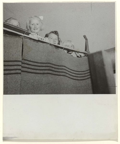 Curator: Robert Frank's gelatin silver print, "Café interior--Pasadena, California," made in 1956, presents such an unassuming scene at first glance. Editor: It certainly has a melancholy feeling. The figures seem trapped, almost suffocated by the interior. There's a strange mixture of stillness and quiet tension. Curator: The grainy texture, a hallmark of Frank's work, speaks volumes about his process. Think of him, traversing America, capturing these raw, unpolished moments. The accessibility of the medium, the portability of his camera, allowed him to infiltrate these everyday spaces. This wasn't about staged perfection, but rather the truth of the moment. Editor: Yes, that sense of immediacy is powerful. And look at the “Merry Christmas and Happy New Year” sign hanging above, juxtaposed against what looks like two somber portraits. There is an incredible emotional contrast created by placing holiday expectations with these characters' states. Curator: That contrast, it’s essential to understanding Frank's social commentary. He's using these familiar symbols to reveal a more complicated reality. Look closely at the wall: there's a horizontal pipe spanning across and cutting into each portrait’s frame which gives the sense of imprisonment, not festivity. Editor: I'm intrigued by how Frank has arranged the subjects, placing one person behind a prominent chair, partially obscured, and positioning the other further back in a darkened corner of the room, giving him a somewhat mysterious quality. The placement generates a quiet emotional charge. The lack of eye contact, of clear connection…what do you think that's telling us? Curator: It highlights a sense of detachment, a prevailing theme throughout Frank's larger body of work, particularly "The Americans." This image serves as a micro-study of alienation and social isolation during a time of supposed prosperity. Think about how these spaces–cafés, diners–were meant to foster community, and yet Frank reveals their potential for loneliness. Editor: Indeed. By employing a photograph and creating strong, emotive composition, he gives everyday experience, such as simply drinking a cup of coffee, the status of iconographic imagery of quiet sadness. What lingers with me most is the feeling that nothing is truly as it appears. Curator: I agree completely. Frank compels us to consider the inherent contradictions within the American experience, using material reality as a poignant and unforgettable narrative device.