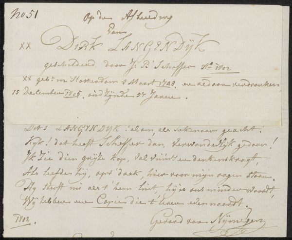 This is a manuscript concerning Gerrit Zegelaar, created by J. Bourse. The artist has penned this text onto paper, an inexpensive and widely available ground, with what appears to be sepia ink. Consider the labor involved in this process; the turning of rags into paper pulp, the grinding of materials to make ink, and above all, the skilled hand required to execute such controlled, elegant script. Each stroke varies in weight and pressure, a direct record of the artist’s touch. The inherent qualities of the ink, its fluidity and tendency to feather slightly on the page, contribute to the work's organic, lively appearance. The creation of this manuscript is not just an act of writing, but a skilled performance, elevating it beyond mere utilitarian communication. By emphasizing the artistry of the hand, the manuscript transcends its function, inviting us to appreciate the labor and skill embedded in its creation. It challenges the hierarchy between craft and fine art.