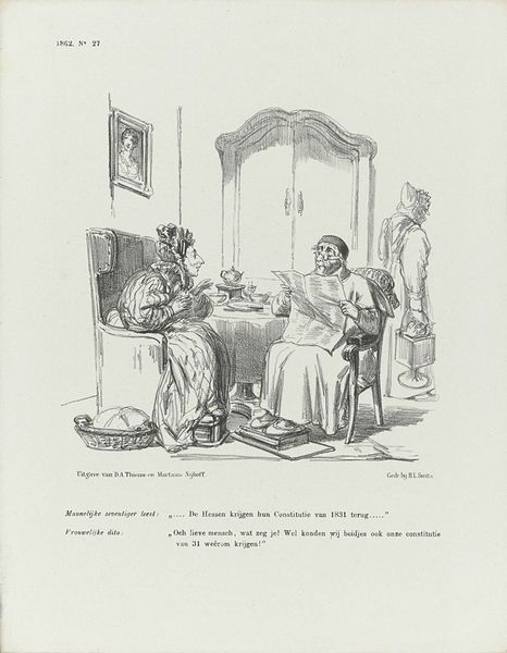 Curator: Looking at John Flaxman’s series of engravings from 1795 to 1817 illustrating Homer, Aeschylus, and Hesiod, one is struck by the linearity and simplicity. Editor: My first impression is that these figures, especially in this plate showing Ulysses at the table of Circe, appear strikingly detached, almost floating in a silent space despite being a narrative scene. Curator: Precisely. Flaxman’s process involved stripping down the compositions to their most essential lines, reflecting the Neoclassical emphasis on form and ideal beauty. These engravings were, in a sense, mass-produced; this allowed for wider consumption and dissemination of classical narratives, reaching audiences beyond the elite. How do you interpret that silence? Editor: I see the silence as heavy with the weight of the choices characters have to make within these ancient myths. Ulysses looks deeply troubled here. Flaxman captures his psychological turmoil so economically, making me think about themes of gender, power and isolation present within the narrative. The social isolation experienced by both Ulysses and Circe is quite noticeable. Curator: It’s fascinating how the medium—engraving—a relatively accessible printing method at the time, contributed to shaping a visual culture steeped in classical narratives. Consider the labor involved in creating these detailed line drawings and transferring them to plates for reproduction; this speaks volumes about the dedication to classical ideals present during this era. Flaxman and other printmakers embraced engraving as an essential tool in the transmission of knowledge during the late 18th and early 19th centuries. Editor: And within those narrative choices lies so much unspoken social commentary. We should think critically about how these classical stories intersect with themes of colonialism, empire, and even early formations of modern European identity. The simplicity allows us, as contemporary viewers, to see these figures in our reflection. Curator: So, while Flaxman’s austere line might appear detached, it opened doors to exploring shared artistic ideals on a much larger scale. It democratized art making and viewing, which I find truly noteworthy. Editor: It is an invitation to consider how we understand ourselves within a continuum of shared cultural narratives. Definitely food for thought.
