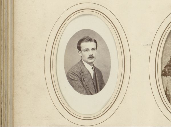 Editor: So here we have, "Portrait of an Unknown Man in an Oval Frame," a photograph created sometime between 1870 and 1890, attributed to Kaufmann & Kesseler. It's such an intimate feeling piece; you really get the sense he's staring right at you through time. What catches your eye when you look at this? Curator: Well, isn't it interesting how a face from so long ago can feel so present? For me, it’s the formality juxtaposed with the ornate frame. The sitter clearly wanted to project a certain image, a dignified restraint. But then you have this swirling, almost baroque frame around him, hinting at a little bit of hidden flair. It makes me wonder about the contrast between who we present to the world and who we are inside, doesn’t it? Editor: Definitely! Do you think the frame maybe reveals something about the photographer’s, rather than the subject’s, personality? Curator: Possibly! The photographer definitely played a part in creating a specific atmosphere. This was an era of carefully constructed appearances, you know? The choice of frame, the pose – these were deliberate artistic decisions. Almost like crafting a stage set. Imagine if this image was within a minimalist, square frame; it’s meaning will completely shift, wouldn’t it? It would probably look stark and distant. I bet the original photo album that it comes from has more hidden hints that could unravel a fuller picture. Editor: It is fascinating to think how different framing completely alters the emotional narrative. It really highlights the subjective choices involved in creating even the most "realistic" of portraits. Curator: Precisely! It goes to show, every image, even one that seems so straightforward, is full of layers and stories just waiting to be unfolded. Now you have me wondering even more about his personality beyond that oval frame!