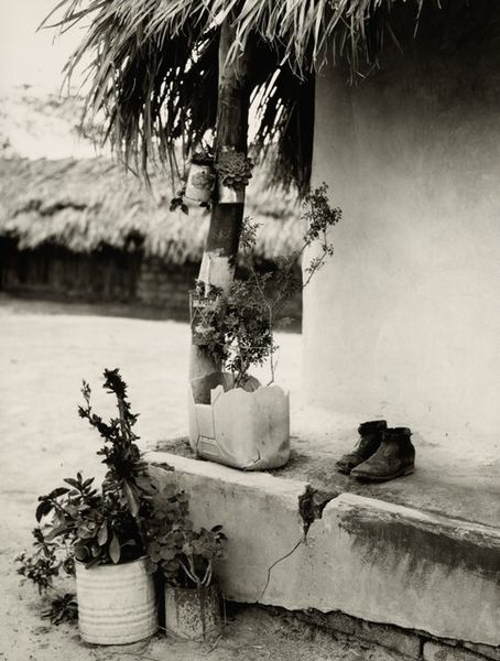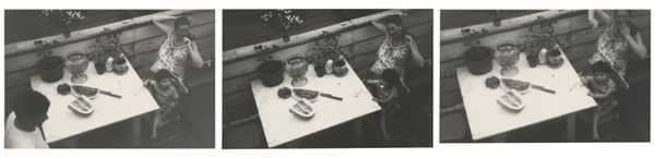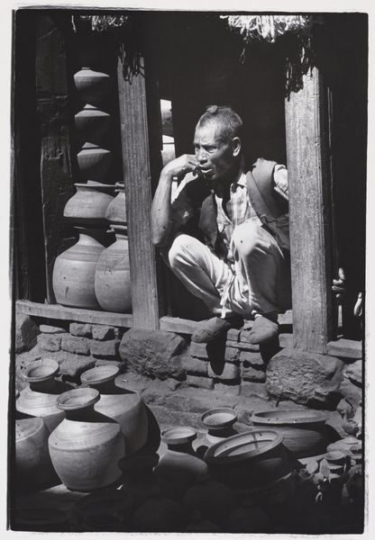 Curator: Robert Frank's "Barcelona," taken in 1952, greets us in gelatin-silver print. What strikes you first about this image? Editor: The starkness. It’s gritty, honest. Makes me feel uneasy. Are those bags of seeds? And what's with the medical imagery propped up behind them? It's like a very bizarre market stall selling... hopes and fears, perhaps? Curator: You’ve touched on something vital. The photograph showcases a street vendor's stall—indeed selling herbal remedies, or at least that's my initial understanding of what these may represent—with accompanying portraits seemingly promising cures. Notice the unsettling depictions of ailments in the photos: a diseased arm, faces marked by what could be skin conditions. It juxtaposes folk remedies with almost clinical depictions of illness. Editor: Right. The positioning is key, isn’t it? Frank’s framing emphasizes that jarring connection between, say, rustic traditions and then… biomedical authority or the human body in the clinical gaze. It raises all these complex ideas of healing, of bodies, power. This image predates the rise of Big Pharma, but it captures something essential about public trust, doesn't it? Or lack thereof? Curator: Absolutely. There’s a deep undercurrent of questioning authority in Frank’s work. These images weren't simple documentation; Frank was sifting through layers of societal fabric, exposing its textures, its fault lines. And that's what's unsettling. We're not passive observers; we're implicated. Even the grey monochrome adds to this grim outlook on the human condition and medical treatments. Editor: Yes. And look how he disrupts visual harmony. Those haphazard stone blocks behind the makeshift stall. It’s far from picture-postcard Barcelona. There’s also a sense of alienation captured so well through this almost brutally realistic lens. Curator: His ability to transform the ordinary into the extraordinary through subtle compositional and tonal shifts—this defines his particular photographic genius, for sure. “Barcelona”, though bleak, reveals a world where desperation and hope intertwine, leaving a memorable aftertaste long after our viewing has finished. Editor: Ultimately it provokes dialogue around healthcare accessibility, folk traditions, and social inequities still prevalent, almost three-quarters of a century later. Thanks for that insight.