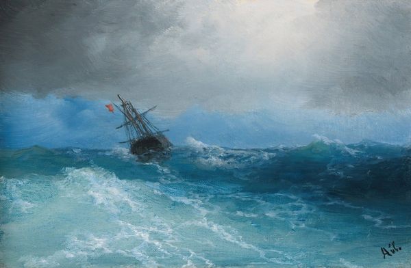 Editor: This is "Sea" by Ivan Aivazovsky, painted in 1898. It’s an oil painting, and what immediately strikes me is the immensity and chaos of the ocean. What do you see in this piece from a historical perspective? Curator: The late 19th century was a time of massive naval expansion and exploration. Aivazovsky, as the official painter of the Russian Navy, both benefited from and contributed to the romanticized image of maritime power. Note how the small, fragile boat is juxtaposed against the overwhelming power of the sea. Editor: It's almost like a symbol of human ambition versus nature’s force, right? I can see a commentary there. Curator: Exactly. Aivazovsky's seascapes weren’t just pretty pictures; they reinforced Russia’s self-image as a powerful maritime nation. The state used images like this to stir nationalist sentiments, promoting the idea of conquering nature and expanding its reach. Consider who the intended audience for a work like this would have been at the time. Editor: I suppose wealthy patrons, maybe even those involved in shipping or naval administration? Did that influence his artistic choices? Curator: Absolutely. Aivazovsky wasn’t just depicting the sea; he was crafting an image of Russian strength and imperial reach for the elite. He controlled his narrative by choosing to emphasize certain details while omitting others, painting the type of imagery that upheld existing powers. The sublime quality appeals to a certain sense of authority. Editor: So, this isn't just a painting of the sea; it's a visual argument. It certainly puts the work into a new, political light! Curator: Precisely. Thinking about art in terms of its social function enriches our appreciation and awareness of the artist’s historical time. It helps to examine images as parts of socio-political institutions and ideas. Editor: That's a powerful reminder to consider the context surrounding a work of art and how the art serves a narrative. Thank you!