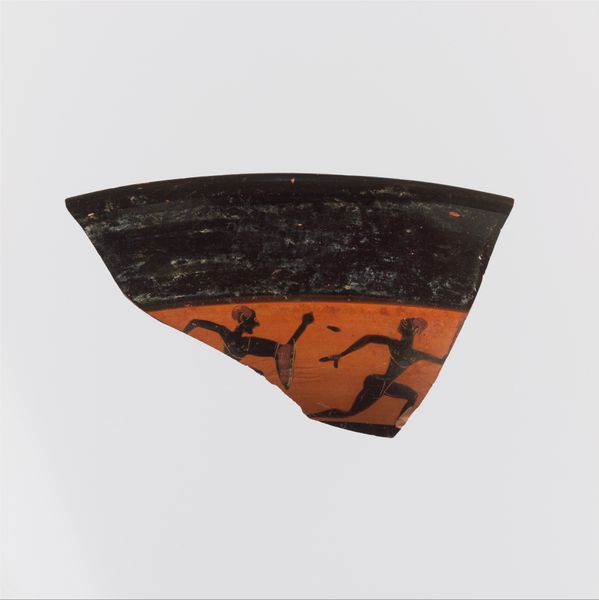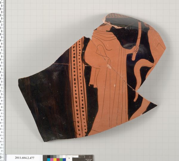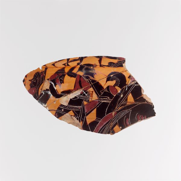 This fragment of a terracotta calyx-krater, or mixing bowl, was made by an anonymous artist in ancient Greece. Though fragmentary, the red-figure technique gives us insight into the socio-cultural life of the period. The scene likely depicts a symposium, an important aristocratic institution in ancient Greece. Symposia were typically private drinking parties where men engaged in philosophical discussions, recited poetry, and enjoyed music and dance. The presence of elaborately dressed figures suggests the wealth and status of the participants. These vessels, like this krater, were important as a symbol of social status. The imagery offers a glimpse into the values and norms of ancient Greek society, where drinking, intellectual discourse, and male bonding were celebrated. Understanding this fragment requires historical research into ancient Greek social customs, artistic techniques, and the role of symposia in shaping cultural identity. Examining similar artifacts and scholarly texts helps us reconstruct the broader context and interpret its significance within the framework of ancient Greek society.
