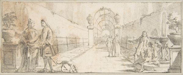 Curator: This is "Scene under an Arcade," a drawing by an imitator of Francesco Guardi. It’s part of the Harvard Art Museums collection, measuring about 39 by 28 centimeters. Editor: The scene is so evocative! The monochrome palette lends a kind of timeless quality, almost dreamlike, as if glimpsed through memory. Curator: Indeed. Guardi and his followers often depicted Venetian scenes, capturing the city’s unique atmosphere. The arcade, with its repeating arches, serves as a stage for the figures within. Editor: The figures themselves are fascinating, almost archetypal. Are they merchants, travelers, or simply passersby? They bring life to the otherwise austere architecture. Curator: Precisely. The arcade serves not just as shelter, but as a social space, shaping interactions and contributing to the overall civic identity. Editor: The drawing style—quick, gestural—emphasizes the transient nature of the moment, the fleeting beauty of everyday life. Curator: It really encapsulates the period's fascination with capturing a sense of place and the social fabric of the time. Editor: A fleeting glimpse into a world both familiar and distant—it truly captures the imagination.