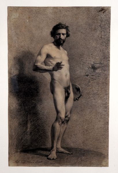 Mariano Fortuny Marsal created this nude male archer drawing using a monochrome palette. Notice how the artist models the male form, contrasting the texture of the figure's taught muscles with the stark lines of the wooden block on which he kneels. Fortuny, in his study, creates a structured composition that emphasizes the tension between the human form and its geometrical counterpart. The archer's pose, with arms extended, forms a dynamic opposition to the static cube, highlighting a contrast between organic and inorganic forms, echoing classical themes of man versus nature. Consider how the limited color range directs our focus to form and shadow, compelling us to consider not just what is depicted, but also how it is depicted. The interplay of shadow and light constructs depth and volume, enhancing the emotional weight of the subject. This formal approach asks us to reflect on the relationship between representation and reality.