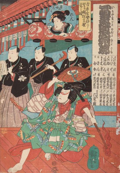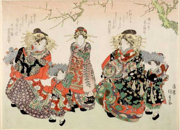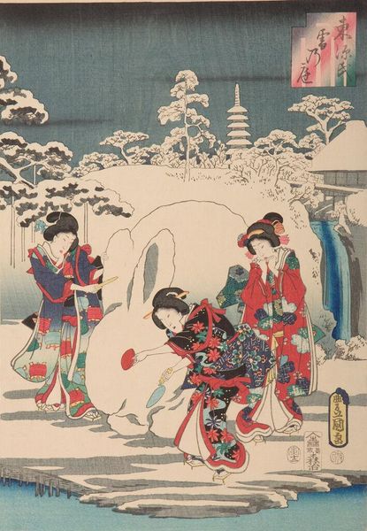 Curator: The Harvard Art Museums hold this print, "Evening Snow at Mimeguri - Actors and Courtesans Getting on a Boat", by Utagawa Kunisada, a master of ukiyo-e, whose life spanned from 1786 to 1865. Editor: Brrr, you can almost feel the bite of the winter air, can't you? The artist really captured that sense of huddling against the cold, those hesitant steps onto the boat. Curator: Kunisada was known for depicting actors, courtesans, and scenes from popular culture. Here, the figures are carefully arranged, the composition leading the eye from the snowy bank to the waiting boat. Editor: It's funny how even the snow seems stylized. Everything is so deliberately placed; it's like a stage set, reflecting the theatrical world he so often portrayed. Do you suppose they're headed for some after-hours amusement? Curator: Very possibly! These prints were often commissioned or sold as souvenirs, offering a glimpse into the pleasure quarters and entertainment districts of Edo period Japan. Editor: It's more than a glimpse; it’s a tangible mood, isn't it? A little bit of magic dusted with snow. Curator: Yes, a snippet of a vibrant, fleeting moment, expertly preserved.