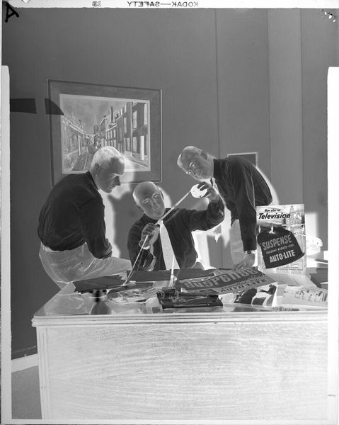 Curator: This photograph, currently titled "Untitled (man at desk with busts)," was created by Peter James Studio. It's a silver gelatin print, measuring about 4 by 5 inches and is part of the Harvard Art Museums collection. Editor: The inverted tones create such a ghostly effect. It looks like the man is communing with his ancestors, or maybe just overwhelmed by the weight of history, judging by those busts looming behind him. Curator: Well, portraits and busts were often used to convey authority and legacy, reflecting the subject's place in society. I wonder what this man's connection to these figures is. Editor: Maybe they're his muses? Or maybe he's just trying to finish his taxes with the pressure of dead philosophers staring him down. It's a wonderfully awkward, revealing moment. Curator: It makes you consider how we build our personal narratives through material culture. Editor: Exactly. It makes you think about your own space and the silent conversations you have with the objects around you.