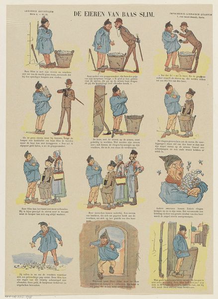 This is "De slaperige grootman" by Rougeran Vignerot, a comic strip, whose date is currently unknown. It presents a narrative about a soldier, offering a glimpse into the dynamics of military life and social interactions during the period. The artwork seems to explore themes of authority, domesticity, and perhaps the disruption of traditional gender roles. We see the soldier in different scenarios, both in uniform and in more intimate settings, which invites us to consider his identity. The inclusion of women and children points to the relationships and responsibilities that intersect with his military persona. Are we seeing a critique of military culture, or perhaps a celebration of it? How does the portrayal of the soldier challenge or reinforce existing stereotypes? Ultimately, the artwork prompts us to think about the complexities of identity and the ways in which individuals navigate the various roles they play in society.