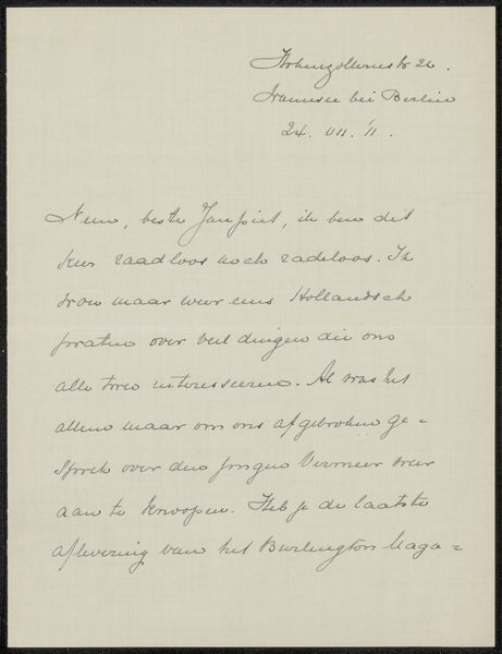 Editor: This is "Brief aan Philip Zilcken," potentially from 1908, made with pen and ink on paper by P. Alfana. The handwriting is really elegant, but it makes me wonder what role something like hand-lettering had at a time of increasing mechanization? How would you read this piece, putting it in a historical context? Curator: That's a keen observation. In an era embracing industrialization and mass media, the persistence, even the elegance, of handwriting speaks volumes. It underscores the cultural value still placed on the personal touch, particularly within artistic and intellectual circles. Note that this is a letterhead from "La Revue de l'Art Ancien et Moderne." What does that suggest about the letter's purpose? Editor: So it connects Alfana to the art world directly... perhaps even the politics of art publishing? Curator: Precisely. Journals like "La Revue" were key players in shaping artistic taste and critical discourse. This letter is less a personal message and more a potential transaction within the art establishment, negotiating relationships and ideas, so that penmanship becomes a tool for curating that professional persona. Do you think the identity of Philip Zilcken—who the letter is adressed to—matters in any way? Editor: Knowing who he is could really shed light on the specific network Alfana was operating in and potentially about an expected power dynamic. Maybe they knew each other well? Maybe they didn’t. Curator: Exactly! Context informs so much. And it invites us to ask what survives outside of an object—the power of institutions, who can make their mark, and how personal relationships build cultural history. Editor: It is incredible to see how much social weight something like handwriting carries within a simple letter! I hadn’t thought about that before. Curator: Thinking about these broader historical structures and how art operates as a force gives these everyday things much deeper relevance.