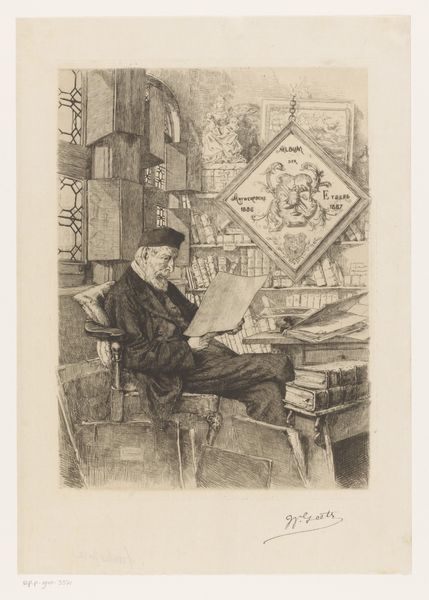 Willem Geets created this print, "Young Woman Thinking at a Writing Table," sometime during his career in the 19th century. Geets was part of a generation of artists who navigated a rapidly changing world, influenced by both academic traditions and emerging social concerns. Here, we see a woman, possibly a scholar or writer, lost in thought amidst her work. Her posture and the books surrounding her suggest intellectual engagement, yet there is a pensive, almost melancholic expression on her face. In the 19th century, the role of women in intellectual and creative fields was often fraught with societal expectations and limitations. This image offers a glimpse into that tension, capturing a moment of introspection. It invites us to consider the complex inner lives of women, who were forging paths in traditionally male-dominated arenas. There's a quiet strength in her solitude that speaks to the silent battles fought in the pursuit of knowledge and self-expression.