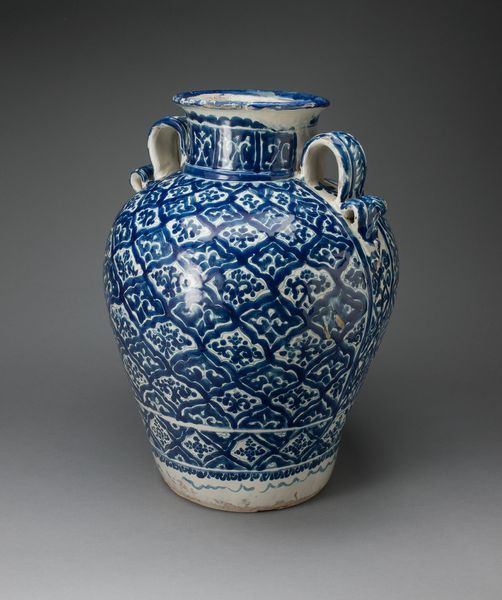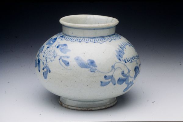 This ceramic jar, made by an anonymous artist, presents a study in contrasts through its simple yet striking design. The rounded form of the jar is immediately softened with a bright white glaze, over which cobalt blue designs dance, creating a dynamic interplay between form and surface. The painted floral patterns and geometric band introduce a dialogue between organic and geometric shapes. These motifs create a visual rhythm that guides the eye around the jar's circumference, alluding to the continuous cycle of nature and the structured order of human design. The texture of the ceramic, smooth yet subtly uneven, speaks to the handcrafting involved, a testament to the tactile qualities of the medium. What is interesting is how the artist destabilizes any fixed meaning; while the floral patterns evoke themes of growth and beauty, the geometric pattern suggests formality, thereby engaging with perception and representation. The jar becomes a site of ongoing interpretation, with the eye constantly moving between the curves of the flowers and the sharp angles of the design.