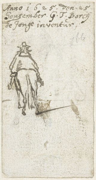 Harmen ter Borch made this drawing on paper with pen and brown ink in the 17th century. The fluid lines capture a tender moment as a young boy supports a child learning to walk. The quick, informal nature of the drawing suggests it might have been a preparatory sketch for a larger work, or perhaps a spontaneous observation of everyday life. Ter Borch's choice of materials reflects the artistic practices of his time, where ink drawings were common for studies and preliminary compositions. The brown ink, easily flowing from the pen, allowed for expressive lines and shading. The texture of the paper, though aged, adds to the drawing's character. It invites us to consider the work and labor involved in artistic creation. It also challenges us to look beyond the immediate subject matter and appreciate the broader context of 17th-century Dutch society, where artists like Ter Borch played a crucial role in documenting and interpreting the world around them.
