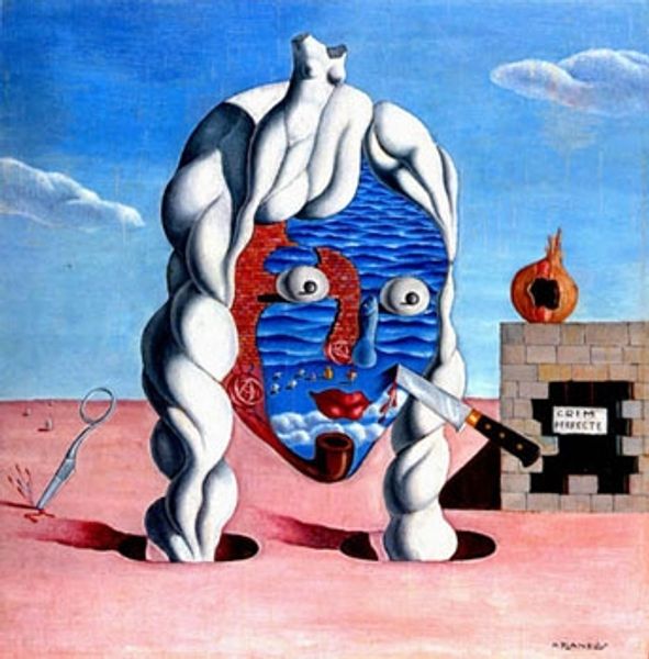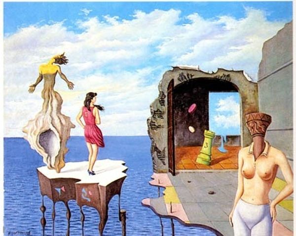 Curator: At first glance, this is undeniably unsettling. It’s like a fragmented dream. Editor: This is Angel Planells’s "Hamlet," created in 1938 using oil on canvas. It offers an intriguing take on the famous Shakespearean character. Curator: "Intriguing" is one word for it. That draped blue form in place of a head… what does that evoke for you? The skull, of course, immediately conjures Hamlet’s famous soliloquy. Editor: Absolutely, the skull is iconic, pregnant with meaning about mortality and contemplation, but placed on the extension of the blue shroud, it transforms. It’s almost presented as an offering or perhaps a specimen. Curator: I am struck by the composition, divided as it is. On one side we see a bizarre representation of the protagonist and an abstract setting; on the other we have a quasi-realistic depiction of an interior space, bisected by an expanse that looks almost like a flooded room or unreal floor pattern. The ambiguity is so potent. I think there is a sense of how power dynamics affect an individual placed on a stage set as "Hamlet." Editor: You are right, the power structure seems to permeate this whole scene, literally, a world gone off-kilter. It is visually striking and uses those dualities, particularly the contrast of light and darkness in color and concept. Even something familiar from the theater takes on a disconcerting look in this painting. Curator: Planells was working in the Surrealist milieu, after all, so it's hardly surprising that clarity is absent and he has introduced unexpected juxtapositions and Freudian concepts. In the broader context of the pre-war years in Europe, works like these spoke to anxieties about authority and the fragility of human existence in the face of global uncertainty. It really mirrors Europe on the verge. Editor: Indeed, Planells seems to grasp this underlying social anxiety so well by presenting this altered version of something so iconic to the public conscious. That deconstruction of Hamlet invites us to re-evaluate not only art, but the wider culture itself, its underlying beliefs. Curator: It’s fascinating to consider the multiple layers of meaning. The familiar narrative refracted through the artist’s singular lens and informed by the sociopolitical backdrop of the time. It certainly leaves a lasting impression. Editor: The work feels almost like a puzzle box. A recognizable starting point with so much psychological unpacking that it reveals new understanding of social anxieties and a cultural icon in surprising and engaging ways.