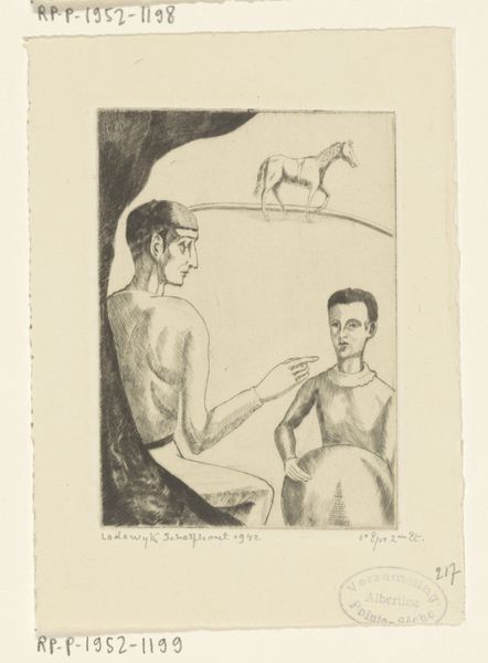 Lodewijk Schelfhout created this drypoint titled 'Two Acrobats by a Circus Ring with Horse'. Born in the Netherlands, Schelfhout lived through a period of immense social change, witnessing the rise of industrialization and shifting class structures that would have a profound impact on art of the time. This print invites reflection on the lives of circus performers, who often existed on the margins of society. The figures are simply drawn; one is seated and the other standing with his arm outstretched as if in the middle of instructing the seated figure. The horse in the background hints at the acrobats' profession. Consider how the artist captures a moment of instruction or preparation. The scene conveys a sense of intimacy. By depicting these figures, Schelfhout asks us to consider the humanity and the everyday existence of those who live and work outside conventional societal structures. It’s a reminder that behind every performance is a life, with its own quiet moments and stories.