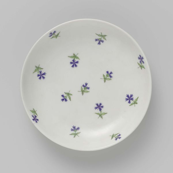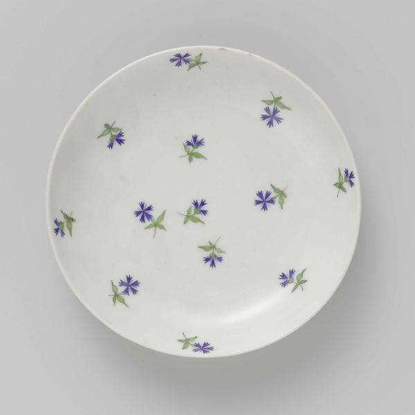 Editor: So, this is a plate, painted with cornflowers, made around 1784 by the Loosdrecht factory. It’s deceptively simple; the delicate flowers scattered on the stark white ceramic seem almost… innocent. What’s your take? Curator: It’s easy to see this plate as purely decorative, but in its time, the production of ceramics like this spoke volumes about social status and the burgeoning Dutch economy. Do you think everyone had access to a delicately painted piece of porcelain like this? Editor: I imagine not. Pottery wasn't always prized as art but how did class affect ceramic's cultural impact? Curator: Precisely. Loosdrecht porcelain factories arose to meet the demand for luxury goods from an emerging middle class eager to emulate aristocratic tastes. The choice of cornflowers isn't arbitrary either. While seemingly innocuous, such imagery participates in the broader politics of imagery that shape even the seemingly apolitical arts. Editor: Politics even on a plate? How would this image engage the viewer? Curator: Consider who controlled the production and consumption of such items, and the visual language promoted values of domesticity and nature, reassuring and subtly shaping societal views. How do you think these images helped? Editor: So the art plays a role beyond aesthetics in a society’s power structures… I will consider such details and their potential impacts going forward. Thank you. Curator: A vital insight for art and its effect! It can completely shift how we read seemingly quaint and precious art like this.