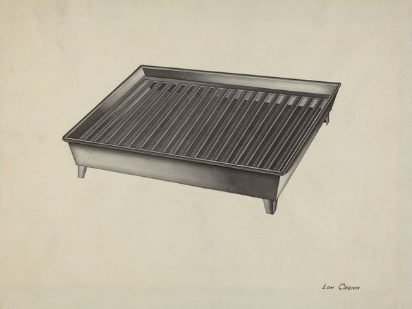 Editor: Here we have a drawing of a "Shaker Tin Dish Drainer," created around 1941 by Lon Cronk, rendered in pencil. It has this incredibly still and quiet presence. What do you see when you look at this, something beyond just a kitchen implement? Curator: Quiet is a good word for it, isn't it? It's like a held breath. The Shakers, you know, they sought perfection through simplicity, in their lives and their crafts. This drawing captures that ethos so well. There is something intensely satisfying in its almost austere lines, the subtle gradations of shading…it's more than just a drainer, it’s a vessel for a whole philosophy. Makes you wonder what kind of mindfulness went into its creation. Editor: Absolutely, the composition focuses entirely on the drainer. No distractions. Does the medium, the pencil drawing, have anything to do with this austerity? Curator: Oh, definitely! Pencil… it’s humble, unassuming. Think of the care and precision required. There's an honesty to it that a more flamboyant medium would likely obscure. Editor: So it is like the Shakers used to say? “Beauty rests on utility.” Curator: Precisely! You got it. It’s the utility refined to its purest aesthetic form, laid bare by the simple lines of pencil. What I find wonderful is that something as everyday as a dish drainer can hold such profound meaning. Editor: This drawing made me think about finding beauty in simple things. Curator: Yes! This work urges us to contemplate the beauty in utility and to approach our tasks, even the most mundane ones, with a kind of reverent attention.