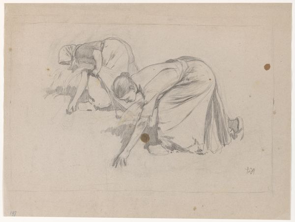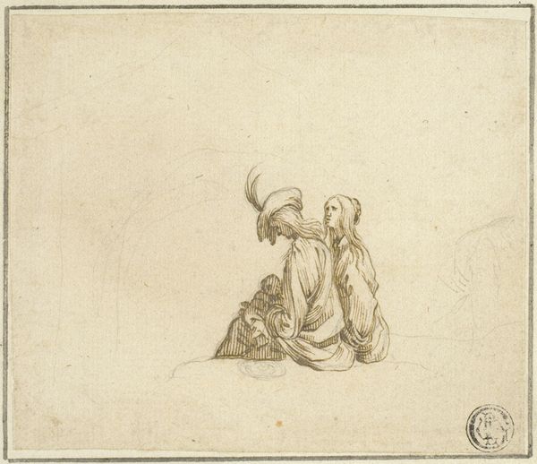 Editor: So, here we have "Meisje in een landschap met enkele geiten" by David Alphonse de Sandoz-Rollin, made sometime between 1750 and 1809, using pen, pencil and ink. It looks like a quick sketch. The sparseness of the lines makes me wonder if the artist meant for it to be so... bare. What strikes you when you look at it? Curator: Formally, observe the dichotomy between the detail in the figure and the relative abstraction of the landscape. Note how the lines describing the girl are more continuous, suggesting form and volume, whereas the surrounding elements are gestural, almost symbolic. How does that distinction guide our reading? Editor: I guess it does force you to focus on the girl as the main subject, despite her blending into the landscape. Does the contrast in linework signify anything about her relationship to her environment, maybe a sense of detachment or belonging? Curator: Consider instead how the artist employs hatching and cross-hatching techniques to build tonal values in the figure's drapery, contrasting with the almost calligraphic strokes that represent foliage. This elevates her presence but it also gives her form and weight. The drawing employs simplicity of shape combined with subtle texturing and therefore is the work itself made or unmade. Is the formal device or its inherent expression the defining moment in the drawing's language? Editor: I see what you mean. It's less about feeling and more about how the artist's choices affect our focus and perception. That close analysis is interesting! Curator: Indeed. The tension created by formal contrasts often speaks volumes.