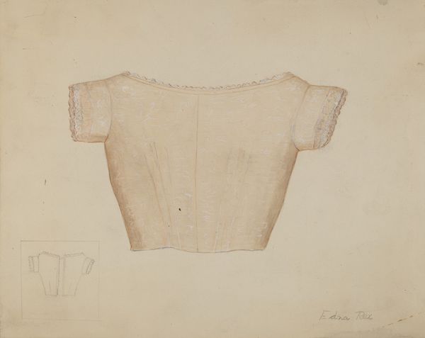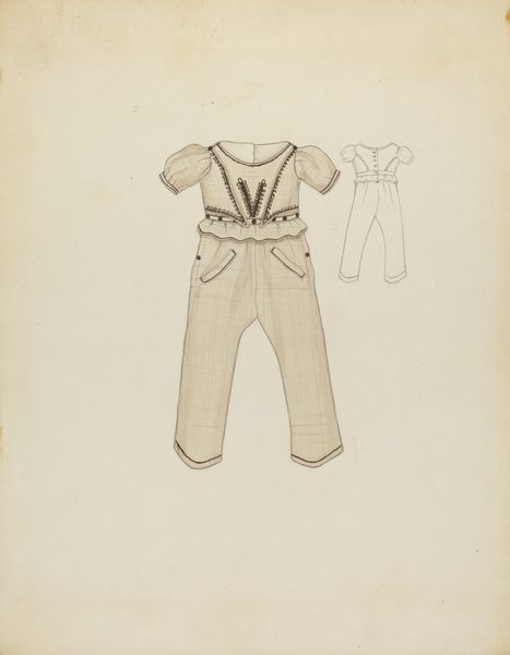 Curator: Standing before us is a drawing entitled "Man's Miniature Shirt," dating back to around 1936 and created by Sylvia Dezon. Editor: My immediate response is to the texture and light! There's a remarkable lightness, yet a distinct visual order through careful linear details. The subtle shifts in shading really define the form. Curator: It's tempting to see this merely as a simple sketch of a shirt, but consider the context. In the midst of economic depression and pre-war anxieties, fashion and clothing became significant symbols of aspiration and normalcy. This drawing likely served as a template or design proposal, hinting at broader economic and social structures of the time. Editor: True, the drawing's precision emphasizes geometric purity and understated design, a real sense of structure emerges from the collar, bow tie, and cuffs. I keep circling back to how those fine pencil lines construct the overall form! The delicate shading around the sleeves gives them volume and makes the object seem almost three-dimensional, which feels contradictory when contrasted with the flat picture plane. Curator: These pieces would have been important documentation within fashion design circles. Designs circulated for inspiration and manufacturing decisions. This drawing, preserved, can be viewed as a social document showing how the fashion industry responded to shifts in taste and economy during that period. Dezon's inclusion as the identified author shows a woman's active contribution to fashion authorship when female agency was not well acknowledged. Editor: The back of the shirt sketched behind seems incomplete. The lines become less distinct and create a soft background effect, setting off the precision of the form shown more fully. Does that choice signal how an idea is made final? What’s the story between front and back? Curator: Excellent question, considering this may represent something that did get realized, a finished prototype that once moved in and shaped its cultural impact, beyond what it simply depicts on paper! Editor: For me, it's the contrast of those intentional compositional decisions that allows light and depth into the scene, making the garment visually appealing on paper and as an aspirational idea. Curator: It’s fascinating how a simple drawing, viewed through these different perspectives, reveals deeper aspects of the design, social conditions, and human experience that might not be immediately apparent. Editor: Yes, beyond representation, it invites us to perceive form in time.