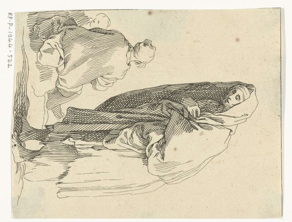 This is Frederick Bloemaert’s etching of a young farmer wandering, made in the 17th century. The initial visual impression is of a figure meticulously constructed with fine lines. Look closely at how Bloemaert uses hatching to give volume to the figure's clothing and body, and how the stark contrast between the etched lines and the blank paper creates a palpable sense of light and shadow. The composition is dominated by the intricate details of the farmer's attire and tools. The lines suggest a sense of movement and texture, from the folds in his clothes to the rough texture of his walking stick. The structural elements invite us to consider the broader cultural codes that might have informed the artwork's making and reception. Note how Bloemaert’s technical skill transforms a simple scene into a study of form and texture. This piece serves not just as a representation but as an investigation into how lines can define shape, create depth, and capture the essence of a subject. It reminds us that art is always open to interpretation, shaped by both its creator and its audience.