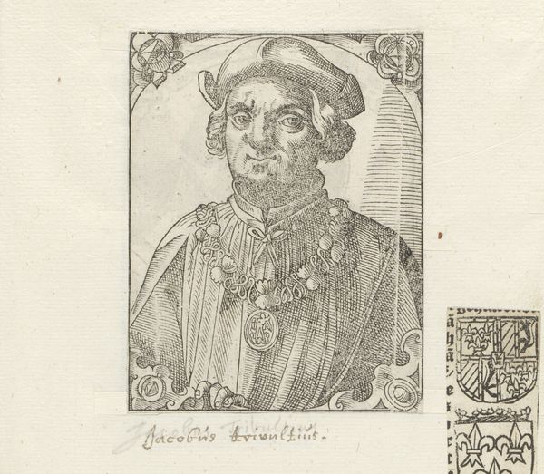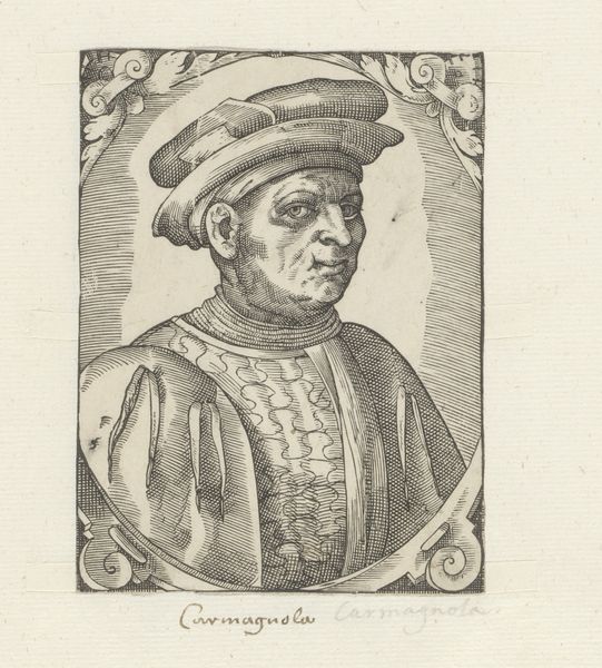 Curator: Look at this remarkable engraving, "Portret van Fagiolanus Uguccio," dating roughly from 1549 to 1575. It is fascinating, isn’t it? Editor: Fascinating and rather severe. The cross-hatching gives a stern, almost forbidding quality. Is that intentional? Curator: Undoubtedly. This type of formal portrait served a very specific purpose, reinforcing status and power. Consider how dress and deportment shape the representation. What might a viewer from the period think? Editor: It’s interesting to think about what is concealed, too. His inner life. Does the engraving challenge our expectations of masculinity within that timeframe, and to what extent is he actively complicit within his representation? Curator: Precisely! It invites us to explore societal pressures. There's also the institutional context. Consider, for instance, who commissioned and consumed such images, and how it affected wider perception. Editor: His attire suggests aristocracy. I also notice a kind of tension between the meticulous detailing in his clothing and face versus the rather static composition, almost frozen. Curator: And the formal border too contributes to that impression, don't you think? This format—the engraved portrait—had a significant role in shaping perceptions of individuals and their place within the social hierarchy. It raises questions around identity performance and the ways in which these performative social positions endure, don't you agree? Editor: Absolutely, but how might those standards affect marginalized people in his court, too, and could this engraving somehow perpetuate the silencing of dissident voices? Curator: Good point, his status as "Mincio Fagiolanus Uguccio Fagiolani" almost becomes a caricature—but within this system he also actively reinforces its foundations, through presentation of family ties and class status! This seemingly small print acts as a powerful symbol in the long power game, yes? Editor: Indeed. Seeing it with you reveals layers I initially overlooked, moving beyond an appreciation for craftsmanship to confront its complex societal roots. Curator: Yes, looking at art, not as a solitary, detached creation, but as deeply connected to its political time is fundamental, I think. It can start important conversations.