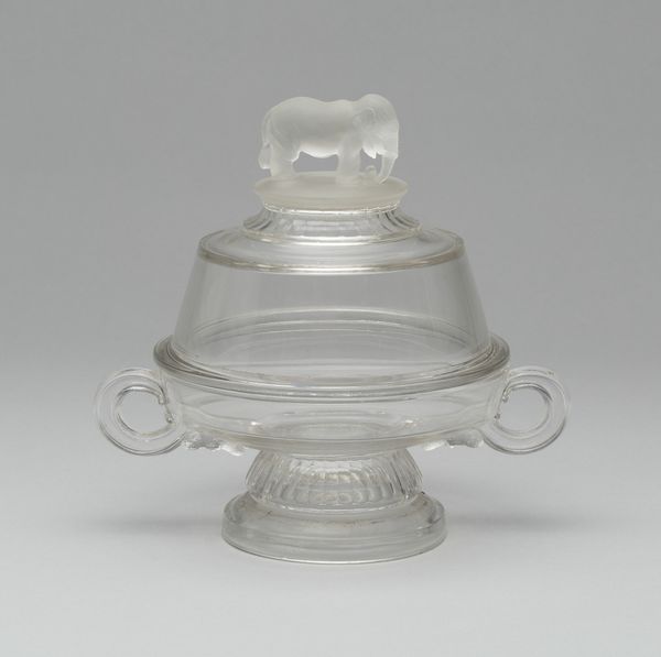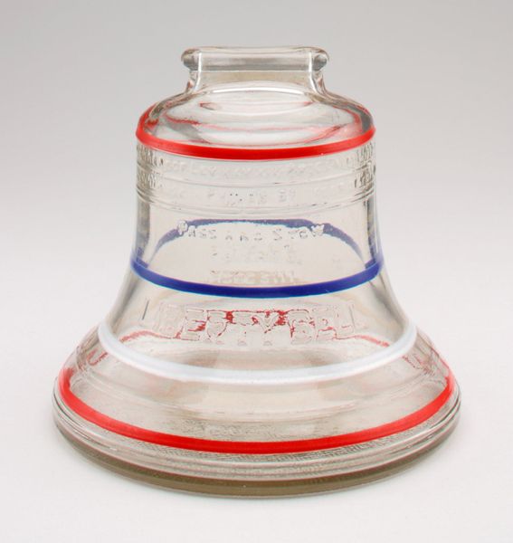 Editor: This is a 20th-century glass still bank in the shape of the Liberty Bell. The see-through quality of the glass gives it an almost ghostlike appearance, especially considering its historical subject matter. What story does this object tell you? Curator: The use of the Liberty Bell as a motif for a bank points to an interesting intersection of patriotism and commerce. This piece likely circulated at a time of increased mass production of decorative objects and financial institutions’ focus on reaching ordinary citizens, and capitalizing on symbols like the Liberty Bell would resonate. Editor: So, it's less about high art and more about the everyday consumer? Curator: Precisely. The Liberty Bell, already a potent symbol, becomes a tool for banks, subtly associating saving money with patriotic virtue. And that its medium is clear glass – is that transparency meant to signal honesty? Editor: That's an interesting angle. Almost like, "see, we're honest, save with us". Do you think where this would have been displayed influenced its meaning? Curator: Absolutely! Picture this on a bank counter, a constant reminder of financial responsibility linked to national identity. Who would have bought this item and where would they put it in their home? It served a distinct role in shaping not just personal finances, but also a sense of national belonging. Editor: It's fascinating to think about everyday objects carrying so much weight of culture and identity. I definitely learned something new about the public role of art and socio-political forces today. Curator: And that, after all, is the value of historicism – how deeply intertwined are aesthetics, commerce, and our political symbols.