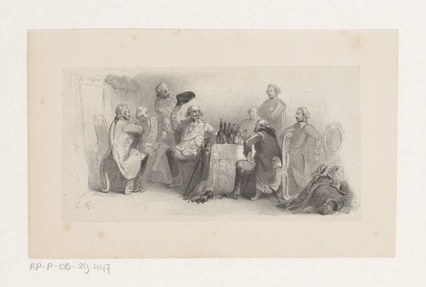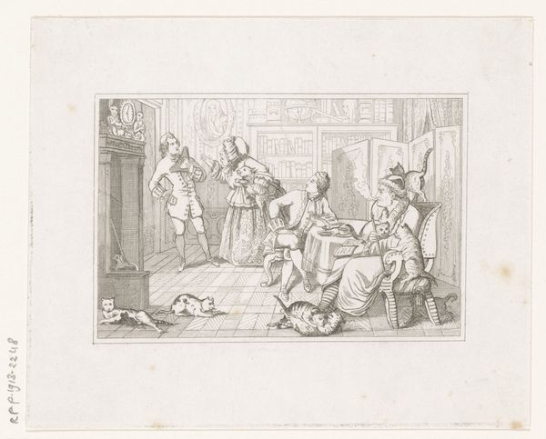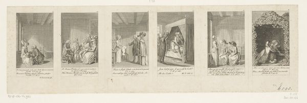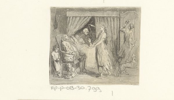 Daniel Nikolaus Chodowiecki created this small engraving, "Sick Man Visited by Death," sometime in the late 18th century. The scene is tightly framed, focusing our attention on the interplay between the figures and the stark contrast of light and shadow that models each form. Chodowiecki masterfully uses line to create depth and emotion. Notice how the diagonal lines of the Grim Reaper's scythe and the outstretched arms of the family members converge, drawing our eyes to the focal point: the sick man. This structured composition invites a reading of the scene as a tableau of human reaction to mortality. The detailed rendering of the figures' expressions underscores the engraving's emotional intensity. The use of a semiotic system of gestures—raised hands, bowed heads—conveys grief and desperation. The artist doesn’t offer a sentimental view of death but rather a study in the formal arrangement of figures within a domestic space, challenging fixed meanings about death and familial bonds through its structured aesthetic approach.