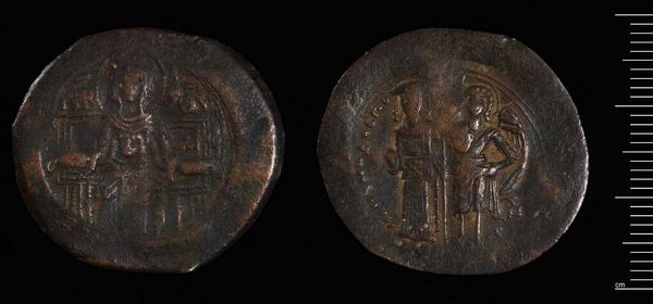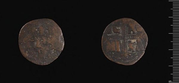 Curator: Here we have a bronze coin of Justinian I, a tangible link to the Byzantine Empire and its socio-political landscape. Editor: The coin’s rough texture and faded details lend it a melancholic air, a fragment of a forgotten age. Curator: Indeed, the depiction of Justinian connects us to the emperor’s ideology of power, but what about the people represented—or rather, unrepresented—on this object? Editor: I'm drawn to the abstract symbolism of the reverse side; it seems to convey power through pure geometric form. Curator: I agree. The coin provides insight into the empire's economic and cultural systems and the power imbalances inherent within. Editor: And the weathering only enhances the narrative of its enduring presence through time. Curator: The coin forces us to consider how empires construct their legacies, and who gets to be remembered. Editor: Precisely, and what the interplay of decay and design reveals about that legacy.