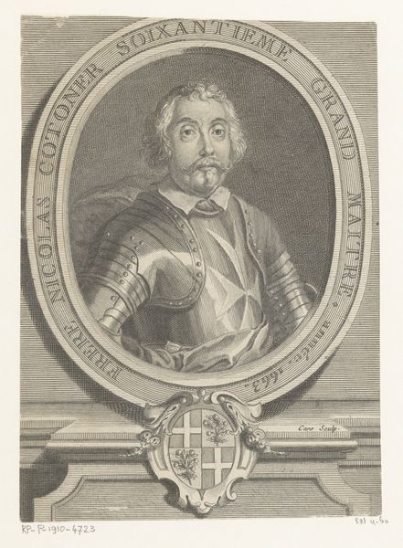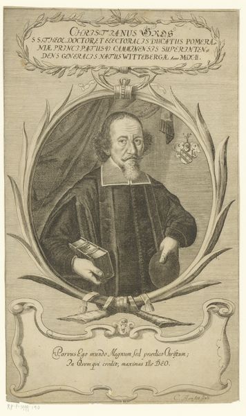 This print depicts historian Filadelfo Mugnos at age 40. It was likely made not long after that, using engraving, a subtractive process of cutting lines into a metal plate. The material reality of engraving gives this print its character. The fine, precise lines, created by the engraver's burin, define the subject’s features. The sharp cuts into the metal plate hold ink, which is then transferred to paper under great pressure. This process demands tremendous skill, indicating a significant investment of time and specialized labor. The medium influences the image’s appearance. The texture is determined by the density and direction of the engraved lines, creating tonal variations and defining forms. Note the details in Mugnos’s face, clothes, and the surrounding text and ornamentation. The act of engraving transforms the copper plate from raw material into a matrix for the reproduction of images, aligning the work with the rise of print culture and information dissemination in the early modern period. By focusing on materials, making, and context, we can appreciate how this print reflects the broader cultural and economic forces at play.