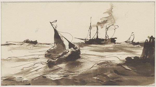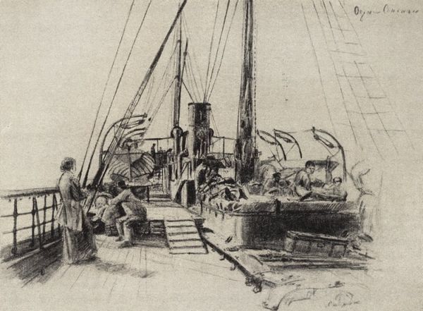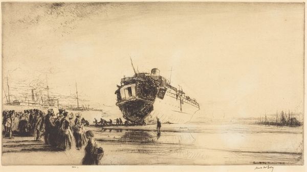 Muirhead Bone etched this print depicting ‘Salvage Men Approaching a Torpedoed Ship’. The stark imagery of men gazing upon destruction evokes a sense of somber anticipation. Consider the gaze—a motif spanning millennia. From ancient Roman sculptures of stoic senators to Renaissance portraits of thoughtful scholars, the direction of sight implies purpose and intention. Here, it unites the men with the wrecked ship, forging a silent dialogue between observer and observed. The act of looking is not passive; it's an active engagement with the grim reality before them. We might recall the Romantic landscapes of Caspar David Friedrich, where solitary figures contemplate the vastness of nature. Yet, while Friedrich’s figures often seek spiritual solace, Bone’s men confront a man-made tragedy, transforming the gaze into a search for understanding amidst chaos. This image serves as a potent reminder of how symbols resurface, adapt, and continue to challenge our perception of history.