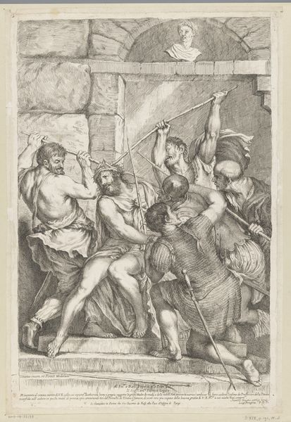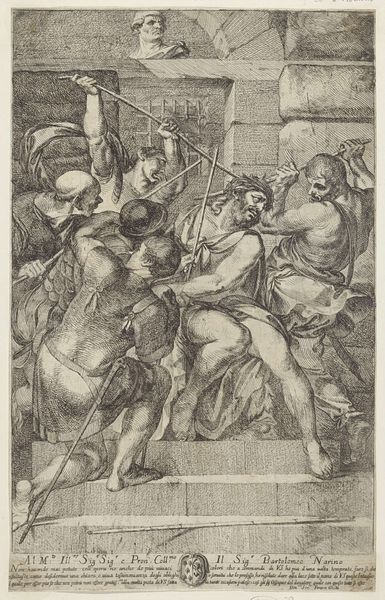 Curator: Here we have an engraving titled "Foltering met dolk en wichelroede," dating from 1565 to 1630. Editor: Well, that’s certainly blunt. Immediately, the starkness of the black lines emphasizes the brutality of the scene; the figures appear contorted and trapped within the rigid architecture. Curator: The work is attributed to Antonio Tempesta and currently resides here at the Rijksmuseum. It’s a piece characteristic of the period, illustrating the baroque interest in dramatic narrative and the explicit depiction of historical events. Editor: Baroque indeed, you can almost feel the strain on their muscles. The composition itself highlights the laborious act; note the detail in the tools left at the base and the clear distinctions between figures designated to inflict violence. It all speaks to a brutal division of labor. Curator: Exactly. These scenes were intended to function within a specific political climate, showcasing power dynamics and sometimes, even sending veiled messages of resistance or moral commentary against abuses of authority, cloaked under historical pretense. It speaks to the relationship between art, power, and the public reception of images. Editor: What's striking is how it presents torture not just as violence, but also as a material process. You see the physicality of the act, the way bodies are manipulated, the specific instruments being used—like the wichelroede. It pushes one to contemplate what that implies about labor, body politics, and ultimately consumption by the public audience. Curator: That tension, between the representation of explicit content and the moral or political intent, is a defining feature of this era’s visual culture. What this tells us about 17th-century ethics and viewing habits is quite disturbing, to be honest. Editor: Right, we see not only the torturer's actions but also the artist’s labor manifest in the intricate line work. It demands we scrutinize the conditions and choices in both realms. A piece so intertwined with human hands forcing pain onto human flesh…the rawness almost jumps out at you. Curator: Yes, certainly not an easy artwork to process, and yet completely revealing of the period it came from, for what was consumed then shaped, in no small way, the history we analyze today. Editor: Indeed. "Foltering met dolk en wichelroede" makes you rethink the labor, context, and sheer violence of the era, making visible things easy to overlook.