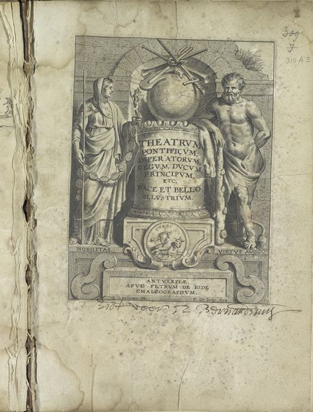 Editor: This engraving from 1684, titled "Theatrvm pictorivm" by David Teniers the Younger, is pretty intense! It's a collection of images within an image, sort of a gallery scene dominated by a central portrait. I’m struck by the allegorical figure and all the layers – what do you see in its complex arrangement? Curator: I see a visual codex of power and memory. That central portrait isn’t just a likeness; it’s an icon enshrined. The laurel wreath, the sculpted pedestal, these are all symbolic markers of enduring status. The allegorical figure, armed and watchful, suggests the active defense of artistic and political legacy. Even the cherubs flanking smaller paintings emphasize this visual vocabulary. Editor: So, it’s all about reinforcing the subject's importance? The Roman-style figure feels separate from the painting copies of people. Curator: Exactly! Notice how the placement of these "lesser" paintings serves to accentuate the main portrait, but they don't exist as "lesser" works within this pictorial language. This hierarchy wasn't unusual; it was commonplace within this culture and time, communicating a clear order to those who understood its vocabulary. How do you think the original audience would respond to these artistic symbols? Editor: I imagine it was all quite clear to them – this would have been recognizable imagery and accessible due to how present history paintings were. It gives it almost propagandistic qualities through clear symbolic messaging. I’ve learned that symbols evolve to carry various meanings throughout time. Curator: Precisely, meanings shift, revealing cultural continuity in surprising ways. Examining artwork as a tool of symbolism is fascinating, right? It makes history into an archive we can "read." Editor: Definitely. It shows the active work of shaping cultural memory, even today.