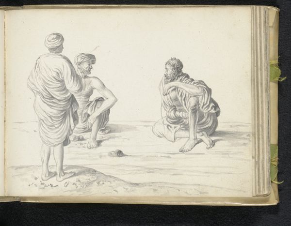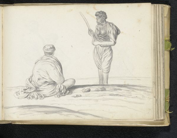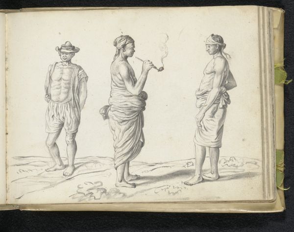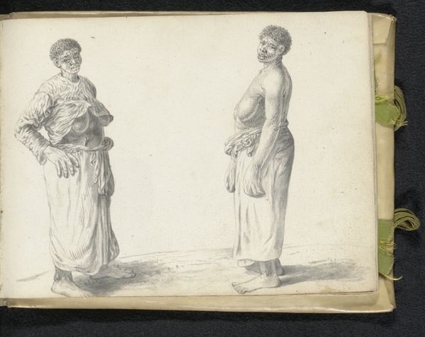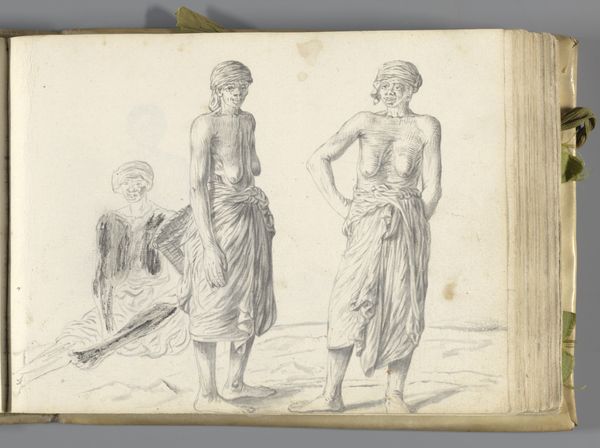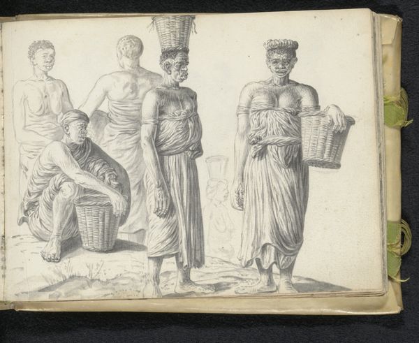 Editor: This drawing, "Five Women" by Esaias Boursse from 1662, is rendered simply with pencil and possibly colored pencil on paper. It has a certain detached feel to it. How would you interpret this work? Curator: The detachment, as you call it, may be precisely the point. Boursse is not merely depicting figures but presenting a social tableau imbued with the symbolic weight of Dutch Golden Age society encountering "the other" during a period of intense trade and colonialism. Note the gaze, or lack thereof. Editor: Interesting! I didn't immediately connect it to colonialism. Are you referring to the figures on the left versus the one standing alone on the right? Curator: Precisely. Consider the visual weight given to water-carrying, a task often relegated to women in many cultures, then consider how the solitary figure looks away. Dutch Golden Age art often encodes moral messages through these types of symbolic arrangements. The very act of depicting these women becomes a commentary. Do you see anything in their postures that reveals the relationship of Dutch traders with the colonies? Editor: I see how the figure on the right seems more formal, reserved even, while the group is posed in what appears like an ordinary activity of the time. Curator: Right, it highlights that distinction. Consider, too, that the figures represent a larger narrative. Every detail – their clothes, the water jug, their posture, is a signifier for something bigger. Editor: So, it is not just a depiction of daily life but carries complex cultural symbolism about cross-cultural encounters. I'll definitely look closer at Dutch Golden Age paintings moving forward. Curator: Indeed. Remember, every image tells a story if we learn how to read the signs.
