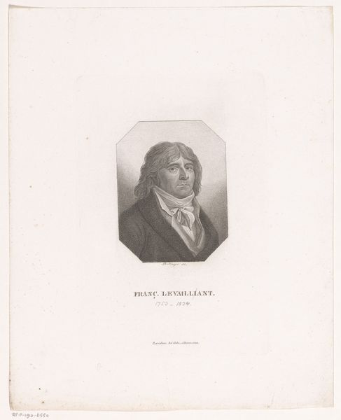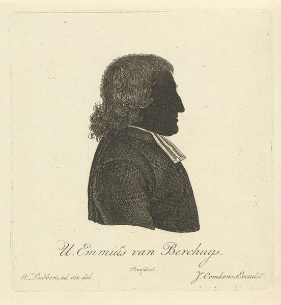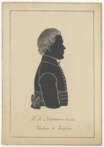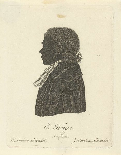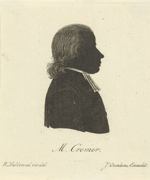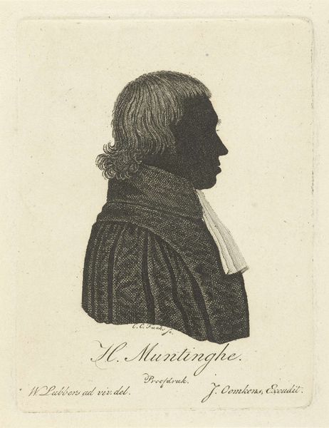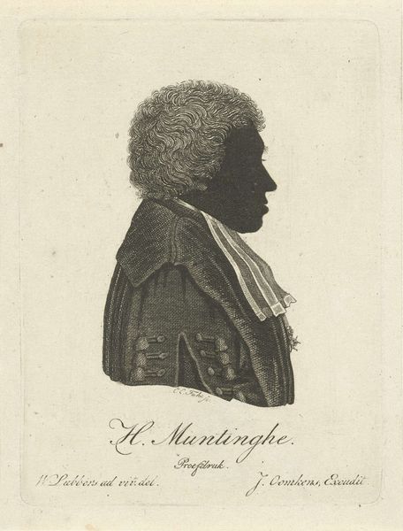 Carl Cristiaan Fuchs created this silhouette portrait of Herman Muntinghe, using etching and engraving, likely in the early 19th century, here in the Netherlands. Silhouette portraits like this one were popular at the time, offering a relatively affordable way for individuals to have their likeness captured. But let's think about what the act of portraying someone signifies within a particular society. This image reflects the values and status of the sitter. Muntinghe's clothing and hairstyle mark him as a man of means. The technology of etching and engraving allowed for multiples to be made, which speaks to the democratization of art. Understanding the history of portraiture, the social function of art, and the economic factors influencing artistic production helps us to interpret the artwork more fully. Museum archives, historical societies, and period publications can illuminate the context in which this silhouette was created and consumed.
