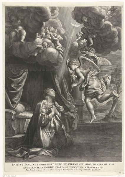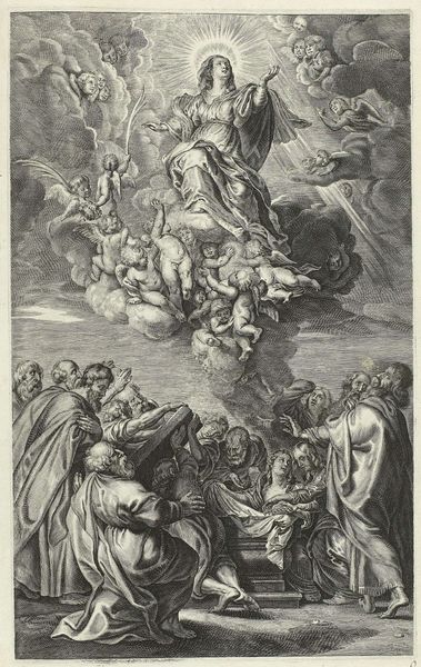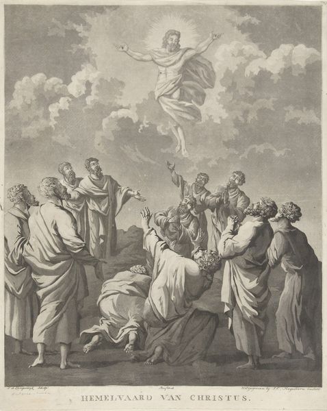 Editor: Here we have Jan Punt's 1745 engraving, "The Deathbed of Abraham," currently housed at the Rijksmuseum. There's something stark yet tender about it. The crisp lines and monochrome palette give it a classical feel, yet the figures are so emotive. What draws your eye when you look at this piece? Curator: It's the dichotomy of the celestial and the terrestrial for me. Above, we have these buoyant cherubs, practically bursting with light and airiness, while below, a scene steeped in earthly sorrow unfolds. It's Baroque drama at its finest. It's a dance between the finite and the infinite. Notice how Abraham is bathed in a divine light while everyone else remains in shadow, weighed down by grief. Is it sentimental? Perhaps. But utterly captivating! Editor: I hadn't considered that play of light and shadow as symbolic. Do you think the artist is trying to make a statement about mortality or faith? Curator: Both, perhaps, intertwined. In a way, it's a celebration of a life lived and a gentle acknowledgement of life's inevitable conclusion. Remember, allegory was big at the time – visualising moral lessons was key. It's interesting that the artist also included cues of genre painting in the representation of emotion and familial relationship, don't you think? The slumped figure at the front almost breaks the fourth wall. It's intimate, isn’t it? Almost intrusive to look upon someone’s grief so candidly portrayed. Editor: Definitely gives you a lot to think about. Curator: It makes you question, what will your deathbed look like? Who will be around you? It reminds you of the great theatre of existence we're all participating in, doesn't it? Editor: It certainly does. I'll never look at an engraving the same way again!