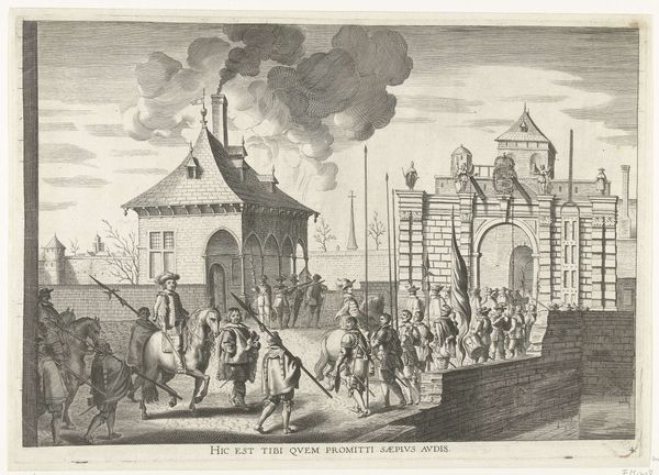 Editor: We’re looking at Pieter van der Borcht's engraving from 1594, “Intocht van aartshertog Ernst bij een stadspoort van Brussel," which translates to "Archduke Ernst's entry at a city gate in Brussels.” The print depicts a grand procession, very ordered, entering through an imposing city gate. It seems to capture a moment of great pomp and authority. What strikes you about this piece? Curator: I'm drawn to the technique and its social implications. The precise, linear quality of engraving was instrumental in disseminating imagery. This print served as propaganda, crafting a specific image of Archduke Ernst’s rule, meant for mass consumption. Think of it – how many impressions could be made? How far could they travel? Editor: So the medium itself becomes part of the message? Curator: Precisely. The deliberate craft involved— the physical labor and time invested in the matrix, the paper, the printing process— highlights the desire to standardize and distribute a particular narrative of power and governance across different social strata. Editor: What about the city gate? Is that also relevant in terms of materials and society? Curator: Absolutely. The gate wasn't just an architectural element, but also a significant symbolic one, built using resources acquired from a specific system of commerce, labor, and consumption. The means to acquire, fabricate and control these resources would communicate more than just power. The Archduke literally passes *through* it; its construction and solidity serve as metaphor for a firmly controlled access to Brussels. Editor: That gives a whole new layer to the idea of "entry" in the title. Curator: Indeed. And thinking about that material reality contextualizes both the historical moment, and artistic intention. We can consider that everything in view, from the Archduke's horse, clothes, to even the print’s physical existence, are the result of production, consumption, and control of specific, crucial resources at a certain point in history. Editor: This has helped me appreciate the connection between artistic representation and real-world social structures so much more. Thanks! Curator: My pleasure! It’s about reading the object in terms of tangible existence, not simply symbolic intent.