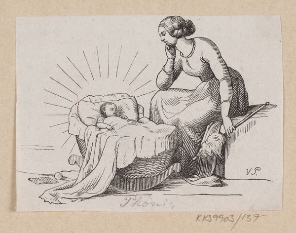 Editor: Here we have an ink and print drawing from H.P. Hansen, dated between 1870 and 1873, an illustration for Hans Christian Andersen’s “The Story of a Mother.” The mood seems very somber and the scene is rather intimate. What strikes you most about this piece? Curator: Immediately, the material choices and reproduction methods interest me. This wasn't meant to be a singular artwork, carefully made for display. Instead, it's a mass-produced image, created via printmaking. The lines, meticulously engraved, become almost mechanical. Consider the labor involved in producing prints. It suggests accessibility and speaks to a broader audience engaging with both image and story. How might this mass production influence the interpretation of the narrative itself, focusing on a common sentiment? Editor: That's a really interesting point. I hadn’t thought about the implications of it being a print. It feels like a very personal, emotional scene, and printing complicates that, but how were prints consumed during this era? Curator: These prints would often appear directly within the book, acting as an intrinsic element to the reading experience, fundamentally altering the act of reading as a tactile and visual process. Consider the economics. Printmaking brought art into homes and lives otherwise untouched by original artworks, impacting notions of class and aesthetic access. The lines delineate both tenderness and sorrow within the constraints of reproducibility. Does the shift from handcrafted artwork to industrial art cheapen or amplify emotion for broader consumption? Editor: I see what you mean! The medium is almost a social leveler, making the mother’s grief accessible across different social strata through reproduced imagery in literature. It is powerful how understanding its making provides such an insightful view. Curator: Exactly. By analyzing the materiality, we moved from personal narrative to a narrative concerning the very structure of society consuming that narrative, shaping not just an aesthetic idea of motherhood, but also a socio-economic one, accessible and, maybe, universal.