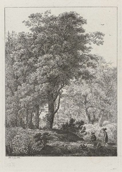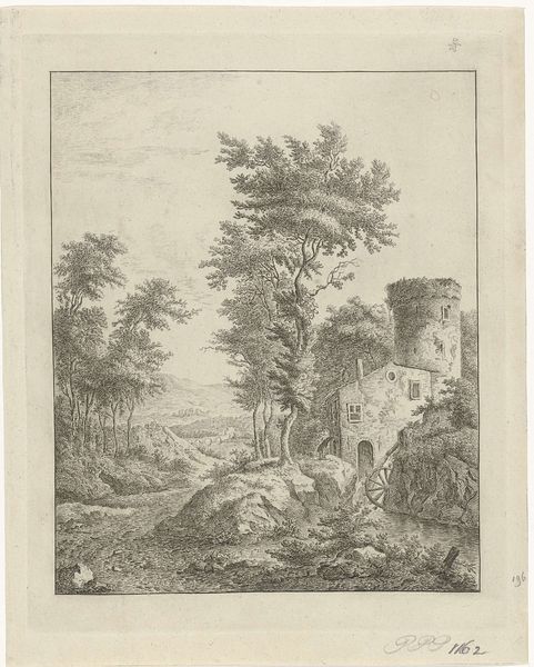 This is 'Farm by the Water' an etching by Leendert Overbeek. At first glance, the fine lines and detailed foliage create a tranquil scene, typical of pastoral landscapes. Yet, Overbeek’s composition goes beyond mere representation; it invites a deeper contemplation of structure and form. The careful placement of trees and the positioning of the farmhouse are not arbitrary. The arrangement creates a sense of depth and a balanced asymmetry. The image's formal structure is a semiotic system. Each element acts as a sign, contributing to a larger narrative about nature, artifice, and human presence. Overbeek challenges fixed meanings through the interplay of meticulously rendered details and soft lines. The natural and the constructed become intertwined, revealing a sophisticated engagement with space and perception. Ultimately, Overbeek's work functions beyond aesthetics, embedding itself within broader philosophical debates about landscape and identity. The interplay between meticulous detail and soft lines compels us to interpret and reinterpret its meaning.