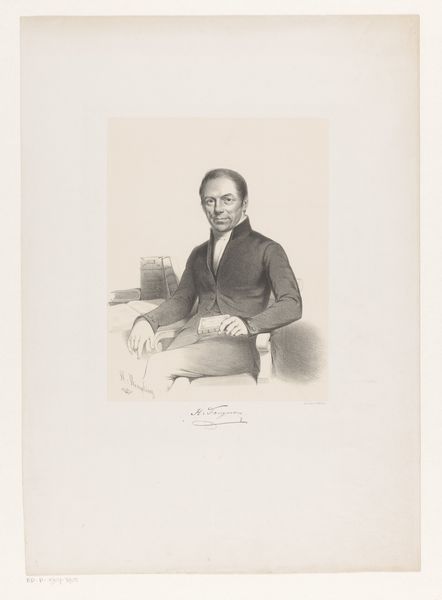 Curator: Here we have "Portret van Daniel Chantepie de la Saussaye," a drawing rendered in pencil, sometime between 1851 and 1874, attributed to Johan Hendrik Hoffmeister. Editor: It’s quite stately. The figure's pose and clothing suggest a certain bourgeois confidence, and the soft grey tonality evokes a quiet, almost contemplative mood. Curator: Indeed. Observe the academic style in its realistic depiction and attention to detail. Hoffmeister employs a range of marks to articulate form, achieving tonal modulation through hatching and stippling. Editor: Considering the material – pencil and paper – it brings a tangible sense of the hand, a deliberate craft, one might ponder the paper's source, the pencil's graphite, even the artist's labour. This was a physical transaction, not just an artistic statement. Curator: A very valid point. Beyond the materiality, consider the semiotic readings: The subject’s attire, his composed demeanor – these project social status. The chair acts as a throne, structuring a formal reading of power. Editor: Did this power reflect broader socio-economic forces? The drawing may have served as propaganda legitimizing social hierarchies or capturing a patron's affluence at a time marked by increasing industrial labor unrest. How was this image consumed, and who benefitted from its circulation? Curator: We can surmise that this piece was most likely intended for viewing by the upper classes, reflecting academic notions of elevated taste. Editor: Right, it is not only the final "art" we should be examining but also the process from material sourcing, the physical act of creating, all the way to its market and audiences that constitute its comprehensive meaning. Curator: Examining "Portret van Daniel Chantepie de la Saussaye" through this conversation reveals much about Hoffmeister's technical skill and a specific societal context. Editor: Precisely, art never floats free of its own world but is rooted in and actively reflects tangible production processes and material concerns.