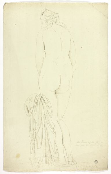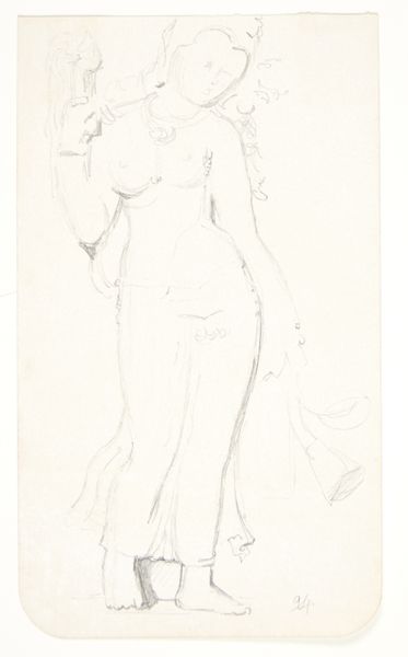 Curator: Good morning, let's discuss "Standing Nude Binding Her Hair," a pen and ink drawing from 1879 by John Dawson Watson. Its romantic style immediately caught my eye. Editor: My initial reaction is to its starkness. The lines are so minimal, almost architectural, yet they create a sensuous figure from what seems like a very rudimentary set of materials. Curator: Indeed, the drawing resides within the traditions of academic art, where mastery of the nude form was crucial, though here it’s rendered with an intimate casualness, departing from purely idealized depictions. Watson exhibited at institutions like the Royal Academy. How would this ink drawing been displayed? Was it a preparatory work for a larger composition? Editor: I'm fascinated by the choice of pen and ink for such a classically-themed subject. The linear quality almost mimics the process of sculpting, paring down the figure to its essential planes. But more than that, where did Watson source the ink? What labor practices existed within pen manufacture? What was the impact on consumer society to be able to purchase mass manufactured pens to create artwork like this? Curator: It does echo sculpting's emphasis on form, while also subtly acknowledging contemporary society. Pen and ink drawings in this era often served diverse roles, from illustrations in books and periodicals to studies for paintings destined for exhibition at the establishment—places which dictated acceptable depictions of the nude. This artwork itself stands at an interesting crossroads, though... Editor: The act of binding her hair gives an excuse for Watson to showcase line, skill and form without revealing identity. Curator: Right, which was itself a subject steeped in Victorian societal and artistic conventions. Editor: And think about how something as simple as the type of paper would affect the absorbency of the ink and therefore the line produced in this sketch! There is a sense of this nude emerging from her raw materials. Curator: The very sparseness, and frankly the erotic undercurrent, make it surprisingly modern when you consider the academic contexts from which Watson emerged. It is almost daring for the time, and reminds us of the ongoing dialogue between tradition and innovation. Editor: Yes, a reminder that even in seemingly simple drawings, layers of context and intention interweave with materials and labor. Curator: Absolutely. I will now carry those insights forward as I approach later artwork.