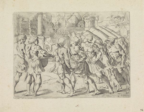 Editor: This engraving from 1663 by Giuseppe Maria Mitelli, titled "Trojans Capture Sinon", is fascinating. The frenzied energy practically jumps off the page. The expressions are quite dramatic. What do you see in this piece, beyond the immediate chaos? Curator: Indeed, the chaos is central. Consider Sinon. Here, he embodies the archetype of the deceptive outsider, a figure distrusted across cultures and eras. The Trojans, blinded by pride and manipulated by Sinon’s false narrative, drag him. What symbols resonate most strongly with you from the classical narrative? Editor: The horse, certainly. But here it’s in the background. More than a symbol, it feels more like the embodiment of impending doom lurking in the distance! It does make me wonder if the artist assumes we know the whole story and therefore can appreciate the weight of this very loaded symbol! Curator: Precisely. Mitelli counts on the cultural memory of his audience, their familiarity with Virgil's Aeneid, to give weight to the scene. This speaks to how shared narratives shape our understanding of events, past and present, no? Think of propaganda… the “stories” nations tell to rally people together. Editor: Wow, that's really insightful, how visual symbols link the Trojan War to modern ideas of nationhood and deception. Curator: The longevity of Sinon’s archetype forces us to consider why societies continue to fear and demonize the “other”. This is why the images resonate, because it exposes a fundamental psychology, even today. Editor: That’s given me a lot to consider about how images build on one another over time. Thanks so much. Curator: My pleasure.