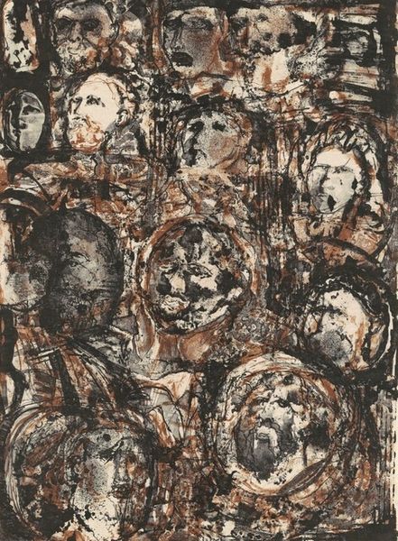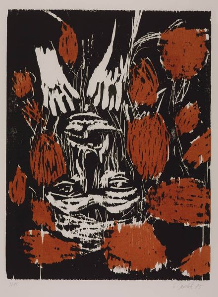 Curator: It is a stark print. Editor: Georg Baselitz’s “Large Head,” created in 1966. It’s a woodcut print, and I’m immediately struck by its rough, almost violent quality. There’s something unsettling about the distortion of the face and the harsh lines. What can you tell me about it? Curator: Note the date of this work, 1966. Germany was still reeling from the aftermath of WWII. The physical act of carving into the wood block – a material rooted in nature yet also industrialized – is, in my opinion, critical here. Do you see a connection? Editor: I hadn’t thought about it like that. So, the choice of wood as a medium, the manual labor of carving it, connects to a broader historical context of postwar trauma and the struggle to rebuild a society? It almost sounds like a metaphor for deconstruction? Curator: Exactly! Baselitz deliberately rejected the slickness of mass-produced images. The very act of production, the artist’s hand wrestling with the material, is visible and palpable. This wasn’t meant to be beautiful; it was meant to be… something else. Editor: The lines, the dark inks. There’s nothing soft or forgiving here. It’s as though the materials themselves are resisting the creation of a conventional, pleasing image. Curator: And it is through this resistance that a different kind of beauty emerges. A beauty born of struggle, of process. What can art be, and what is it made of. These are open ended questions for you to ask yourself, always. Editor: So, the medium and process become integral to understanding the work’s message, its commentary on post-war German society and beyond? I find myself contemplating about material as the fundamental part of every art making decision. Curator: Precisely. It challenges us to think critically about consumption, the very nature of making, and challenges conventional aesthetics by imbuing materials themselves with potent meaning. That, to me, is its enduring power.
