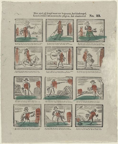 Johannes Egbertus van Lieshout created this print, likely around 1770, featuring a series of images accompanied by Dutch text. In a world on the cusp of revolutionary change, this seemingly simple collection offers a window into the era's social fabric. It is a mirror reflecting the nuances of Dutch society, and likely meant to satirize it. Each scene encapsulates everyday life while subtly revealing societal norms and expectations. The image of a woman carrying buckets or another walking with a child hints at the gendered division of labor, while a man pushing a wheelbarrow speaks to the working class's toil. The presence of a Prussian eagle may allude to the political tensions of the time. Van Lieshout’s print captures the pulse of a society grappling with identity, class, and the winds of change. As you reflect on this artwork, consider how it captures the collective experiences of a community, inviting both contemplation and connection with the past.