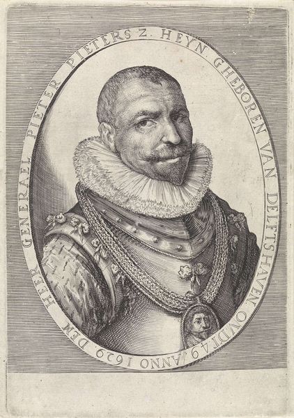 Curator: I’m struck immediately by the incredible detail in this print. There’s almost a velvety quality to the shading achieved with simple lines. Editor: Indeed. What we're looking at is Hendrick Goltzius' "Portret van Jan Baptist van Renesse," created in 1581. It's an engraving, and quite a stunning example of Northern Renaissance portraiture. The piece now resides in the Rijksmuseum collection. What draws me in is how Goltzius captured Renesse, imbuing him with what seems to be a complex personality that’s both authoritative and subtly melancholy. Curator: Precisely. The oval frame containing the subject surrounded by elegant Latin script. The figure almost emerges from a symbolic world, creating a fascinating tension. It makes the portrait not just a likeness, but also an exploration of virtue, mortality, and fame as alluded to by the frame's lettering. What do you make of it? Editor: Yes, the virtue triumphant against envy is interesting and ties into an enduring concept. We have here not merely an individual, but an idealized version. Also consider his clothing - not necessarily symbolic - but it signifies his economic means. Each component speaks to societal ideals and Renesse’s aspirations to align with them, suggesting an interesting lens on personal and collective identity in the late 16th century. Curator: And isn’t this exactly the tension inherent in portraiture of the era? The artist creates, or, rather, constructs a persona through details but also for public consumption. I find myself wondering about Renesse's position in society and how this portrait served to cement his reputation and the larger political forces that might have shaped Goltzius' depiction. Editor: A beautiful idea indeed; Goltzius definitely achieved a sophisticated commentary on human nature and social standing. Curator: An intricate visual argument open to interpretation and contextualization.