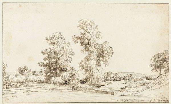 Editor: Here we have Isaac de Moucheron's "Heuvellandschap aan de oever van een breed water", a landscape drawing rendered in pencil sometime between 1655 and 1714. It strikes me as quite serene; a calming depiction of nature. What's your perspective on it? Curator: This drawing invites us to consider the Dutch Golden Age’s relationship with the land and, more broadly, the colonial gaze inherent in landscape art. How do you think the concept of ownership and control plays into our viewing of this seemingly innocent scene? Editor: That's a great question! I hadn’t considered it beyond face value. I guess, looking at it through that lens, I wonder if Moucheron's careful detail implies a sort of surveying of the land, a claiming of it. Curator: Precisely. Think about the social and political context. The Dutch Golden Age was also a time of immense colonial expansion and exploitation. Are there any subtle hints within the composition, perhaps in the power dynamic between land and water or light and shadow, that speak to broader socio-political forces at play? Does it glorify nature, or subtly assert dominion over it? Editor: I see what you mean. The subtle dominance of the landmass over the water, despite the water's breadth, is compelling to consider from the perspective of colonial power dynamics. It suggests a deliberate act of framing. Curator: Yes. It is also crucial to remember that idealized landscape depictions served not just aesthetic but also ideological functions, especially in a time of burgeoning national identity. It made me consider questions of land rights and the often invisible narratives of displacement connected to landscape depictions. Editor: Thank you. I am left thinking about the connection between artistic representation and real-world power structures. Curator: It enriches our experience to move beyond the beautiful scenery to think of what lies beneath.