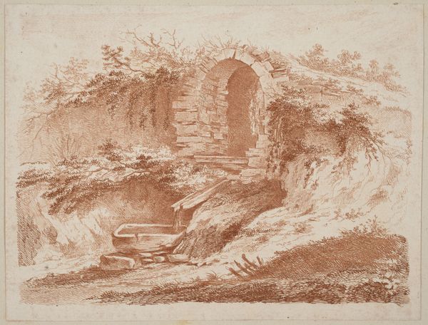 Editor: This is Jan Brueghel the Elder’s “A Hilly Landscape with Figures Near a Ravine,” created in 1595 using ink, chalk, and colored pencil on paper. The sepia tones give it a somewhat melancholic feel, despite the implied activity of figures walking along the ridge. What historical context informs how we should view this landscape drawing? Curator: It's fascinating to consider Brueghel's landscape within the context of late 16th-century Europe. While seemingly pastoral, these landscapes often functioned within very specific social and political power dynamics. What’s immediately striking is its accessibility. Drawings and prints made art available to the middle class for the first time. Editor: So, how did landscapes become politically charged images, specifically? Curator: Well, think about the role of the Netherlands at the time. Brueghel's meticulously detailed landscapes, easily reproduced, allowed people in different strata of society to express collective or individual ownership of this vision of their land. Landscapes often represented ideas of nationhood but equally depicted an individual’s place within society. Who was allowed access to these images was critical. Do you think that Brueghel was trying to promote new modes of spectatorship through distribution, or perhaps reflect those changes happening already in the public sphere? Editor: I’m wondering if the very act of distributing the drawing via print democratized the access to artistic representation and ownership in that sense? Curator: Precisely. The dissemination through print directly influenced not only who could view this image but also shaped the understanding of the landscape as both an aesthetic and symbolic representation of community. What has your viewing of the work taught you? Editor: I will keep this context in mind from now on; to think about who got access to the art is as important as the art itself. Curator: Indeed. The democratization of the visual field, then, shapes and transforms our reading of it to this very day.