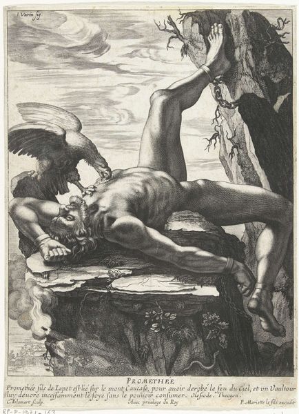 This print of “Plate 7: The Blinded Polyphemus” was created in the 1700s by Bartolomeo Crivellari. The scene is dominated by the massive, muscular figure of Polyphemus, rendered in stark black and white. His contorted pose and agonized expression fill the viewer with an immediate sense of drama and raw emotion. The composition uses strong diagonals and a clear contrast between light and shadow to enhance the visual impact, drawing our eyes to the story's climax. The figures of Ulysses and his companions are small in comparison, highlighting their vulnerability against the monstrous cyclops. Crivellari employs a semiotic system of visual signs to deepen the narrative. The rough textures and exaggerated musculature of Polyphemus signify his brute strength and savagery, qualities set against the smooth lines depicting Ulysses' clever escape. This contrast underlines a broader theme: the triumph of intellect over brute force. The work destabilizes the classical ideal of heroism, suggesting that cunning and deceit can be as effective as strength. The image serves as a point for ongoing discussion about power, vulnerability, and the shifting nature of heroism within Western culture.