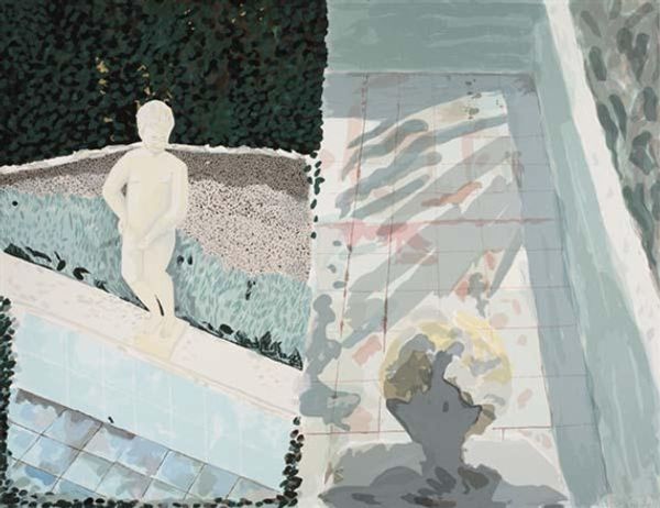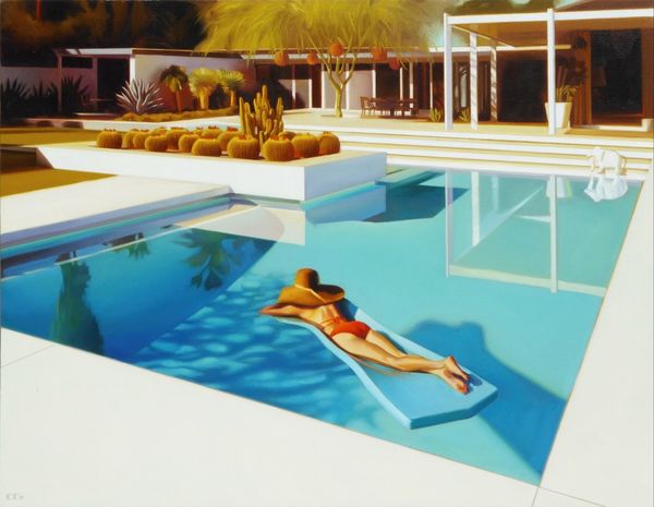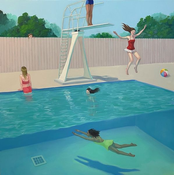 Curator: What strikes me immediately is the quiet unease, the somewhat disconnected feeling despite the communal setting of the pool. Editor: Agreed. I almost feel a bit anxious looking at it! Now, this is Zoe Hawk’s “Free Swim,” an oil on canvas from 2022. There’s something about Hawk’s style… almost photographic, but decidedly painterly. What catches your eye structurally? Curator: It is primarily the composition that intrigues. The spatial organization relies on distinct planes, separating figures—and consequently psychological states—with this insistent geometry. See how the pool’s edge becomes a sharp divide? Editor: Right? It's like they’re living in separate panels of a graphic novel! I love the palette, though; the artificial turquoise of the water clashes beautifully with the strong orange pillars, and how that echoes the bathing suits, giving the eye lots to play with. What’s your read on the overall mood she establishes? Curator: Formally, I appreciate the restrained use of colour that generates an affect somewhat similar to the uncanny—particularly how it relates to an adolescent collective of experience that remains inscrutable. These bathers, they’re not in dialogue. Their narrative is personal. Editor: Maybe that’s the point, you know? We’re all alone, even when we think we’re together! This piece gets you thinking, gets you squirming a little. Maybe that’s Hawk's wicked intention. Curator: Precisely. “Free Swim” offers a commentary through careful arrangement of figure and ground. The individual psyche becomes architecture. Editor: Art as architecture of the soul! I’ll be swimming with that thought for a while. Thanks for the insights!