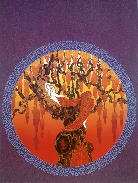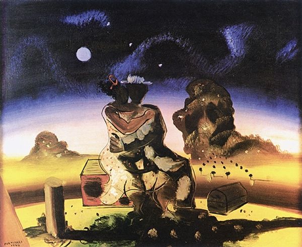 Curator: What a whimsical, otherworldly scene. I’m immediately struck by the bold colours and peculiar geometric shapes. Editor: It is striking! We’re looking at Vangel Naumovski's “Sunset Garden”, an acrylic painting from 1968. Given the period, Naumovski’s modernist and surrealist leanings feel aligned with that moment. It's fascinating to consider its relationship to the political upheavals of the late '60s; maybe this represents a kind of escapism? Curator: Yes, escapism, or perhaps a re-imagining of the world! Notice how he juxtaposes elements—geometric abstraction alongside surreal biomorphic forms. This tension makes the image vibrate with symbolic potential. The floating rings could suggest technological advancement, orbiting nature. Editor: You know, the orb-like shapes make me think of alchemical symbols, a blending of earthly and celestial realms. That recurring motif of the circle certainly echoes wholeness, completion. Consider the red dot too; it brings a folklore touch, evoking a sense of wonder, maybe hinting at childhood. Curator: Folklore ties in! This painting arrived a decade after Marshal Tito formally broke with Stalinism, charting Yugoslavia's course outside the Soviet Bloc. Naumovski seems to be tapping into a deeply-rooted humanism in the region and also advocating for a kind of freedom of expression. I read those tall vertical, phallic forms as standing proud and celebrating this expression. Editor: I see those tall forms too, they echo a longing for connection. It feels hopeful, doesn’t it? Even with its strangeness, it draws you in with familiar shapes and colours, almost as if trying to convey a shared cultural memory. Curator: I think you've highlighted that key theme—it’s not merely escapist, but restorative. "Sunset Garden" proposes an alternative world order—where humanity exists within and in harmony with nature. Editor: A powerful vision that resonates beyond its specific time and place. What starts as alien landscape becomes a space for considering wholeness. Curator: Agreed. Its bold optimism reminds us of the enduring human capacity to envision new possibilities even amidst the chaos of existence.